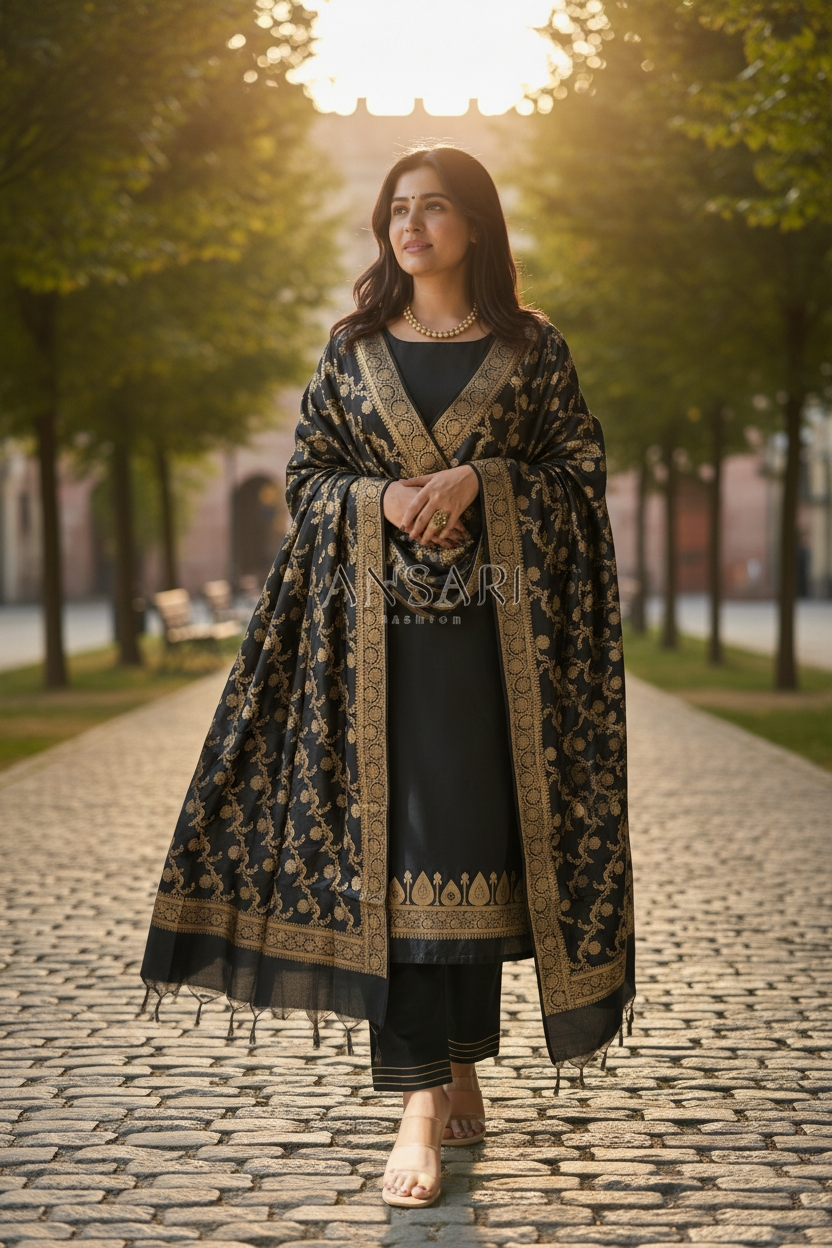 Ansari Fashion presents a *royal Banarasi Silk Zari Woven Suit Set* in an elegant **Black** shade 🖤✨
