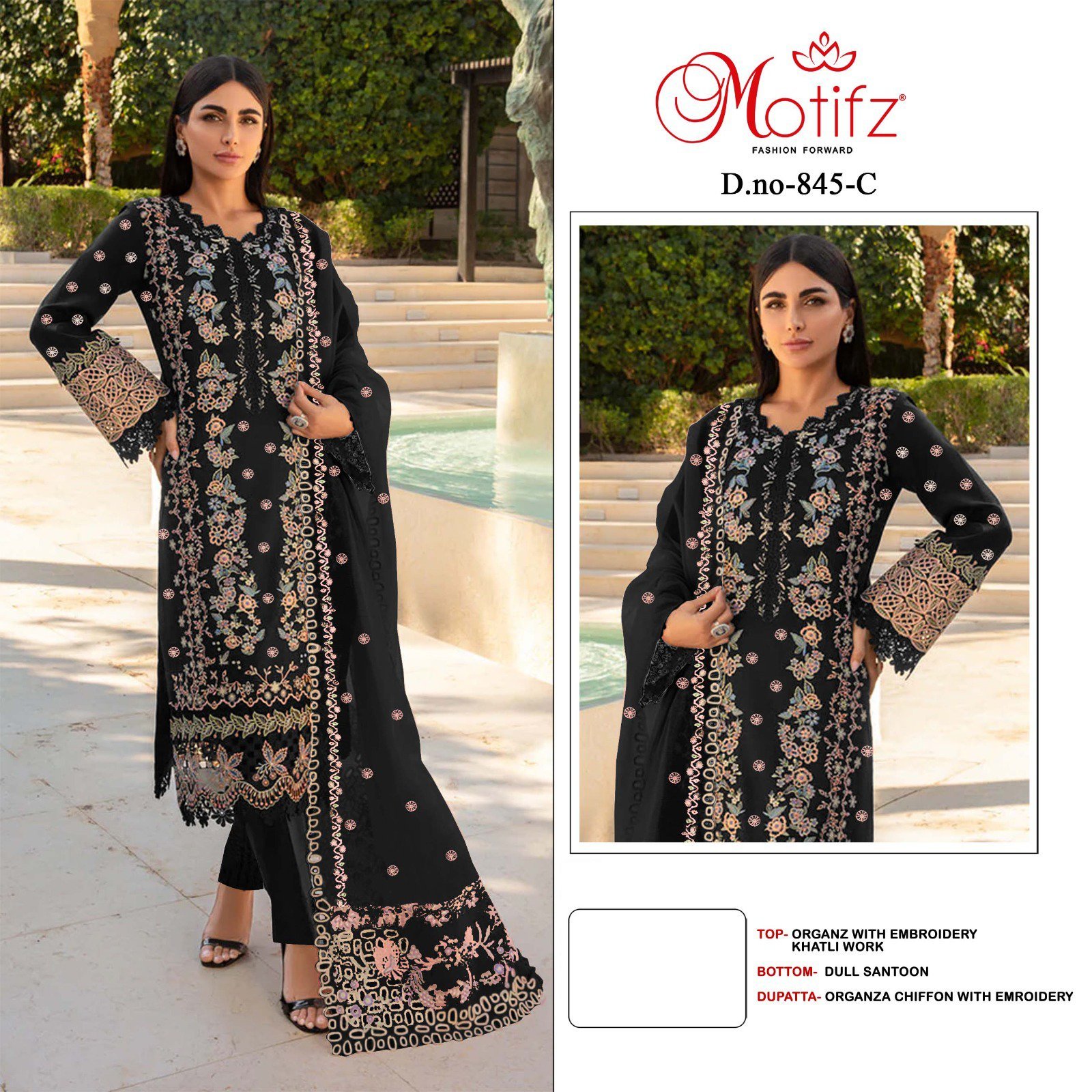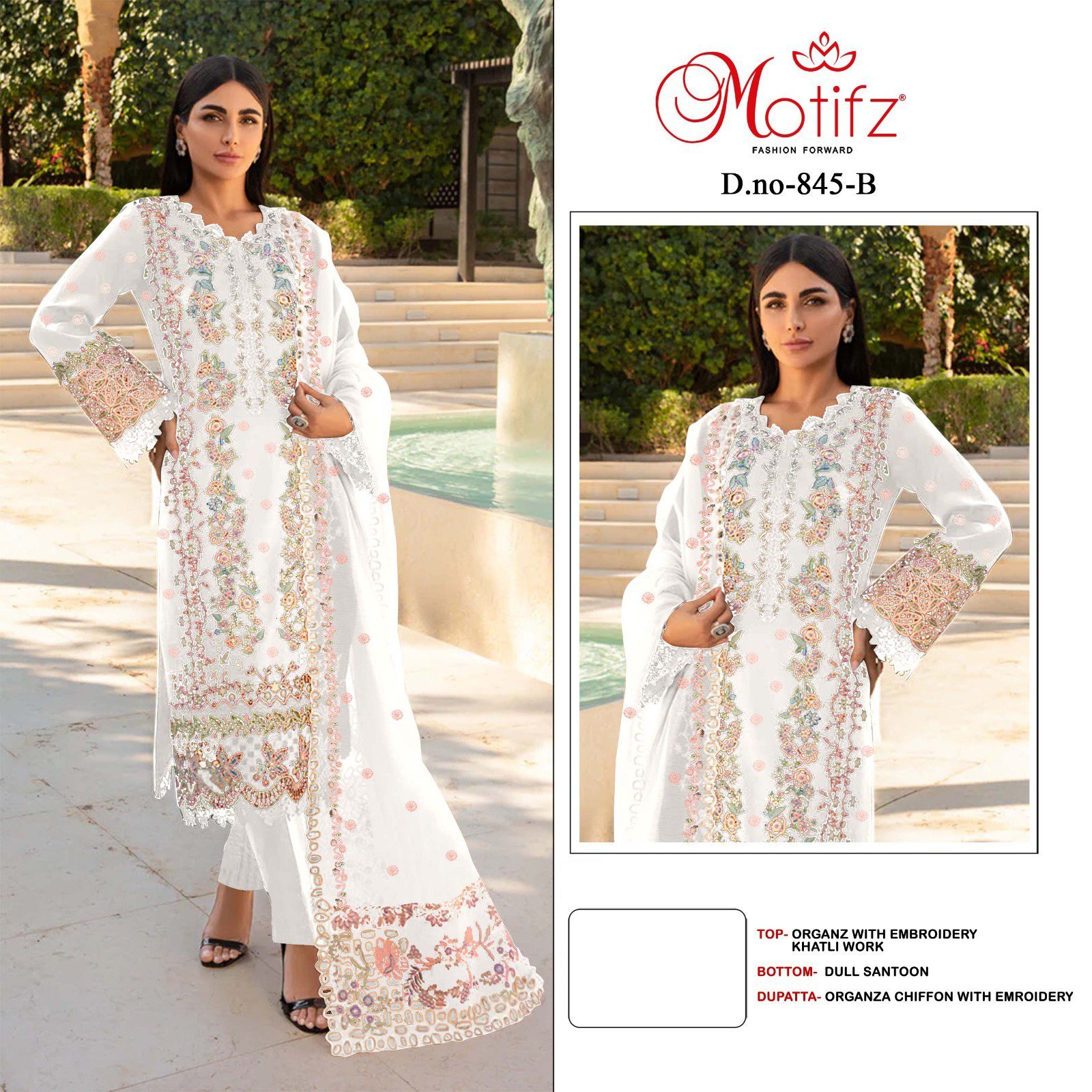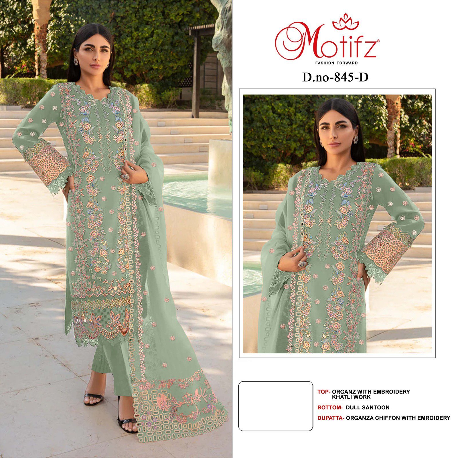 Buy Motifz Surat D. No. 845 Pakistani Suits online – embroidered organza top, santoon bottom & organza dupatta. 4-piece set at just ₹5000. Trending ethnic wear!